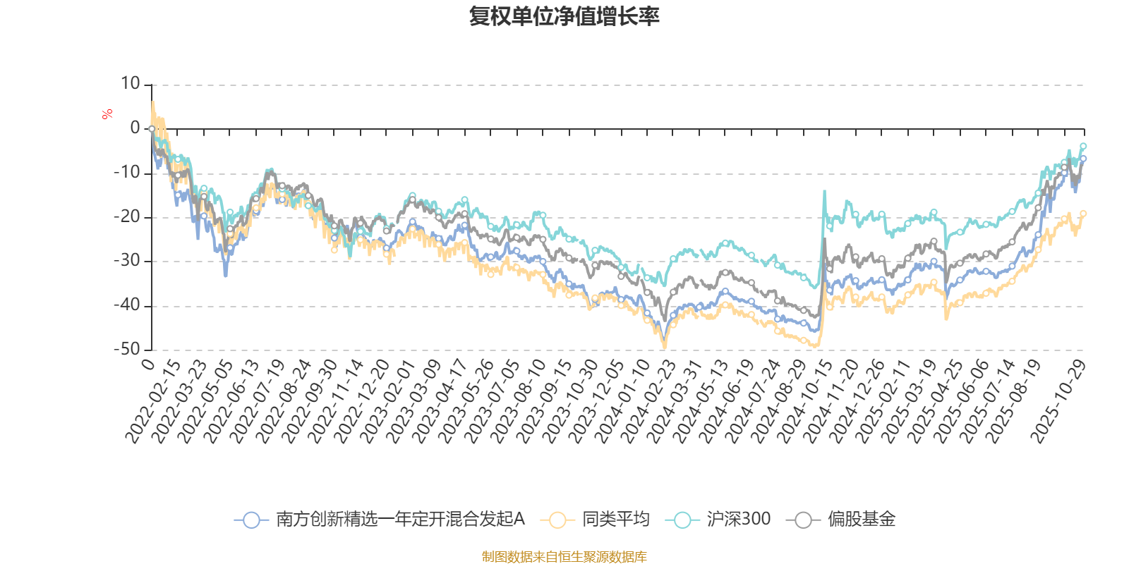 截至10月29日,南方创新精选一年定开混合发起A近三个月复权单位净值增长率为27.18%,位于同类可比基金100/621;近半年复权单位净值增长率为41.67%,位于同类可比基金152/621;近一年复权单位净值增长率为43.13%,位于同类可比基金166/611;近三年复权单位净值增长率为24.20%,位于同类可比基金224/518。