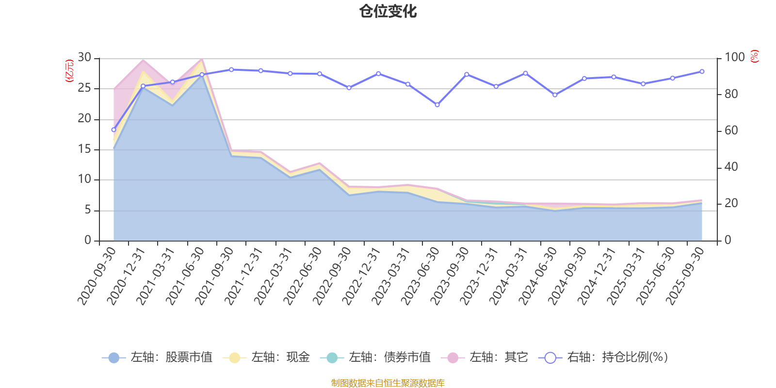 据定期报告数据统计,近三年平均股票仓位为87.13%,同类平均为85.66%。2021年三季度末基金达到93.74%的最高仓位,2020年三季度末最低,为60.83%。
