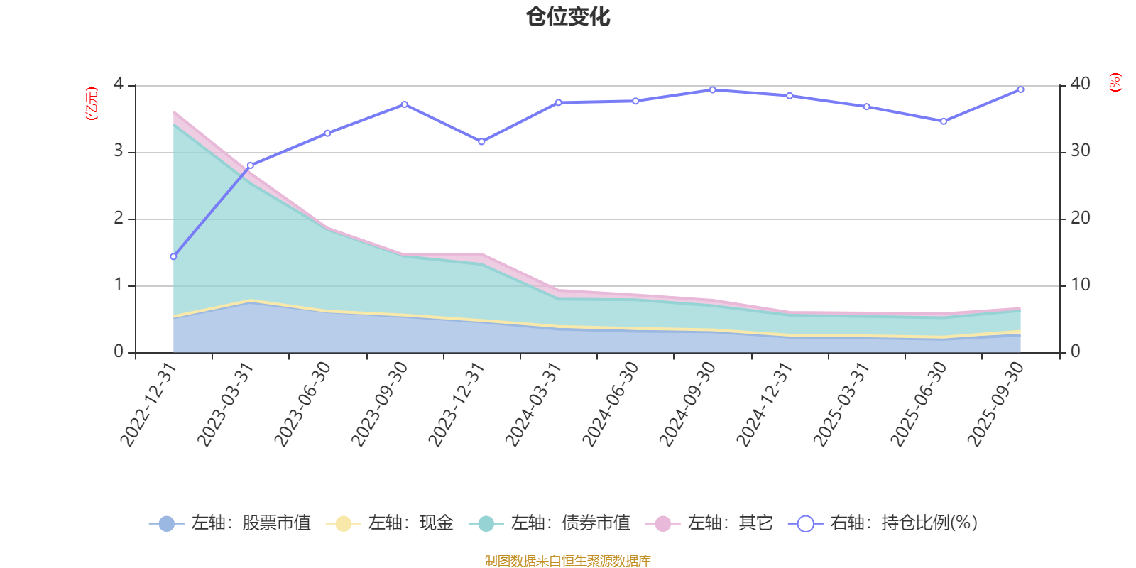 据定期报告数据统计,近三年平均股票仓位为33.95%,同类平均为19.14%。2025年三季度末基金达到39.36%的最高仓位,2022年末最低,为14.36%。