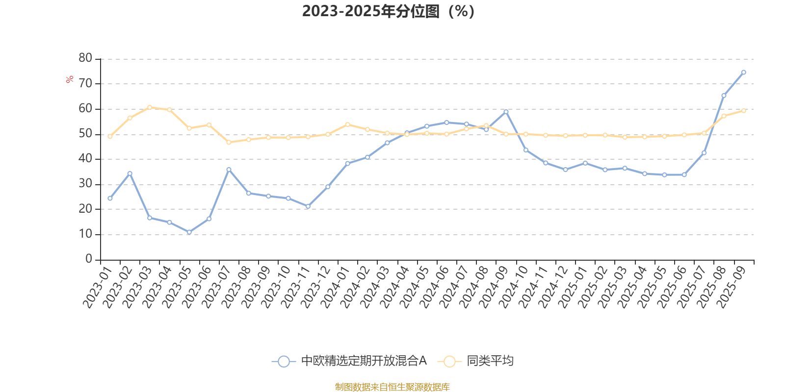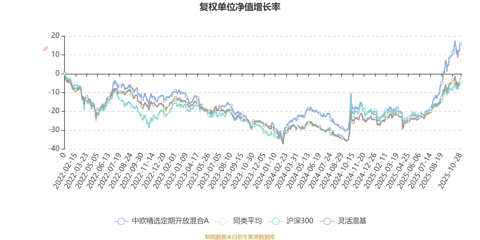 截至10月28日,中欧精选定期开放混合A近三个月复权单位净值增长率为32.70%,位于同类可比基金142/1287;近半年复权单位净值增长率为52.84%,位于同类可比基金141/1287;近一年复权单位净值增长率为40.75%,位于同类可比基金240/1287;近三年复权单位净值增长率为39.37%,位于同类可比基金249/1286。