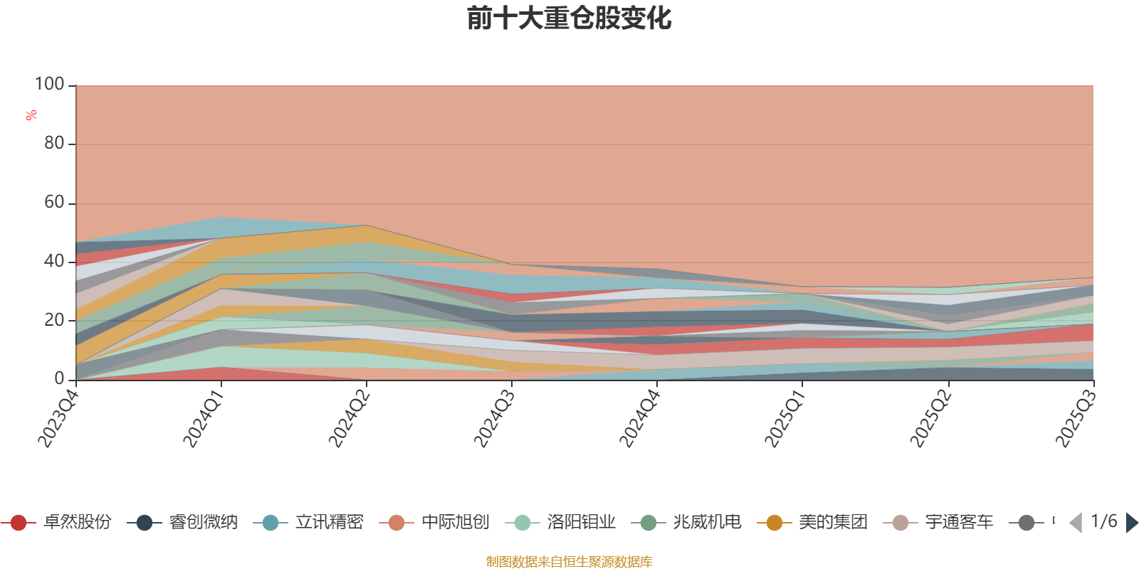 截至2025年三季度末,基金十大重仓股分别是宁德时代、宇通客车、宁波华翔、睿创微纳、中芯国际、海光信息、立讯精密、银轮股份、中际旭创、三花智控。