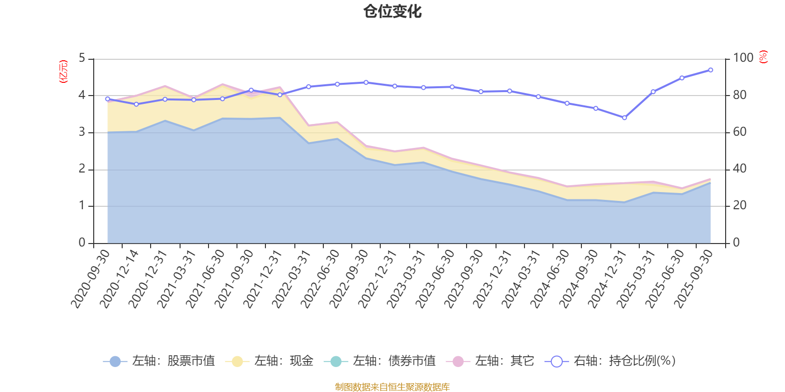据定期报告数据统计,近三年平均股票仓位为81.79%,同类平均为85.66%。2025年三季度末基金达到93.95%的最高仓位,2024年末最低,为68.08%。