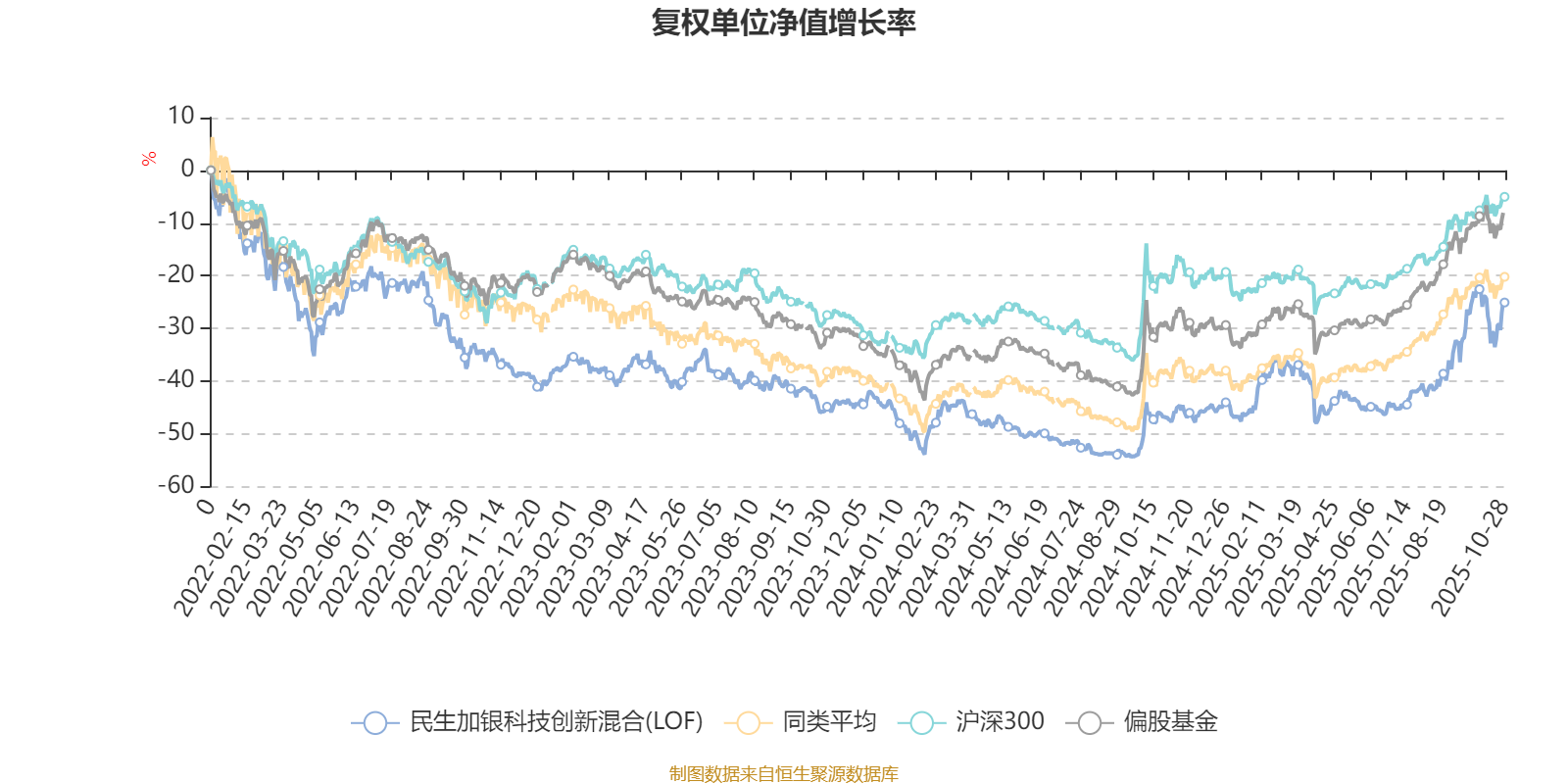截至10月28日,民生加银科技创新混合(LOF)近三个月复权单位净值增长率为27.22%,位于同类可比基金101/621;近半年复权单位净值增长率为33.96%,位于同类可比基金229/619;近一年复权单位净值增长率为41.16%,位于同类可比基金161/611;近三年复权单位净值增长率为17.54%,位于同类可比基金263/518。