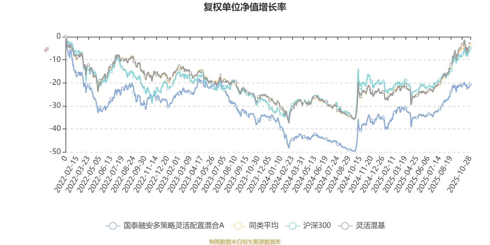 截至10月28日,国泰融安多策略灵活配置混合A近三个月复权单位净值增长率为10.23%,位于同类可比基金697/1287;近半年复权单位净值增长率为22.93%,位于同类可比基金678/1287;近一年复权单位净值增长率为26.72%,位于同类可比基金502/1287;近三年复权单位净值增长率为9.72%,位于同类可比基金796/1286。