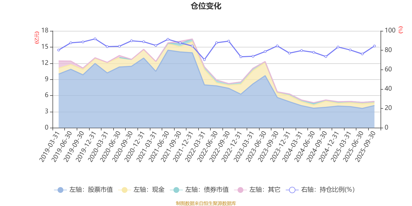 据定期报告数据统计,近三年平均股票仓位为78.59%,同类平均为72.35%。2019年末基金达到91.81%的最高仓位,2022年一季度末最低,为70.34%。