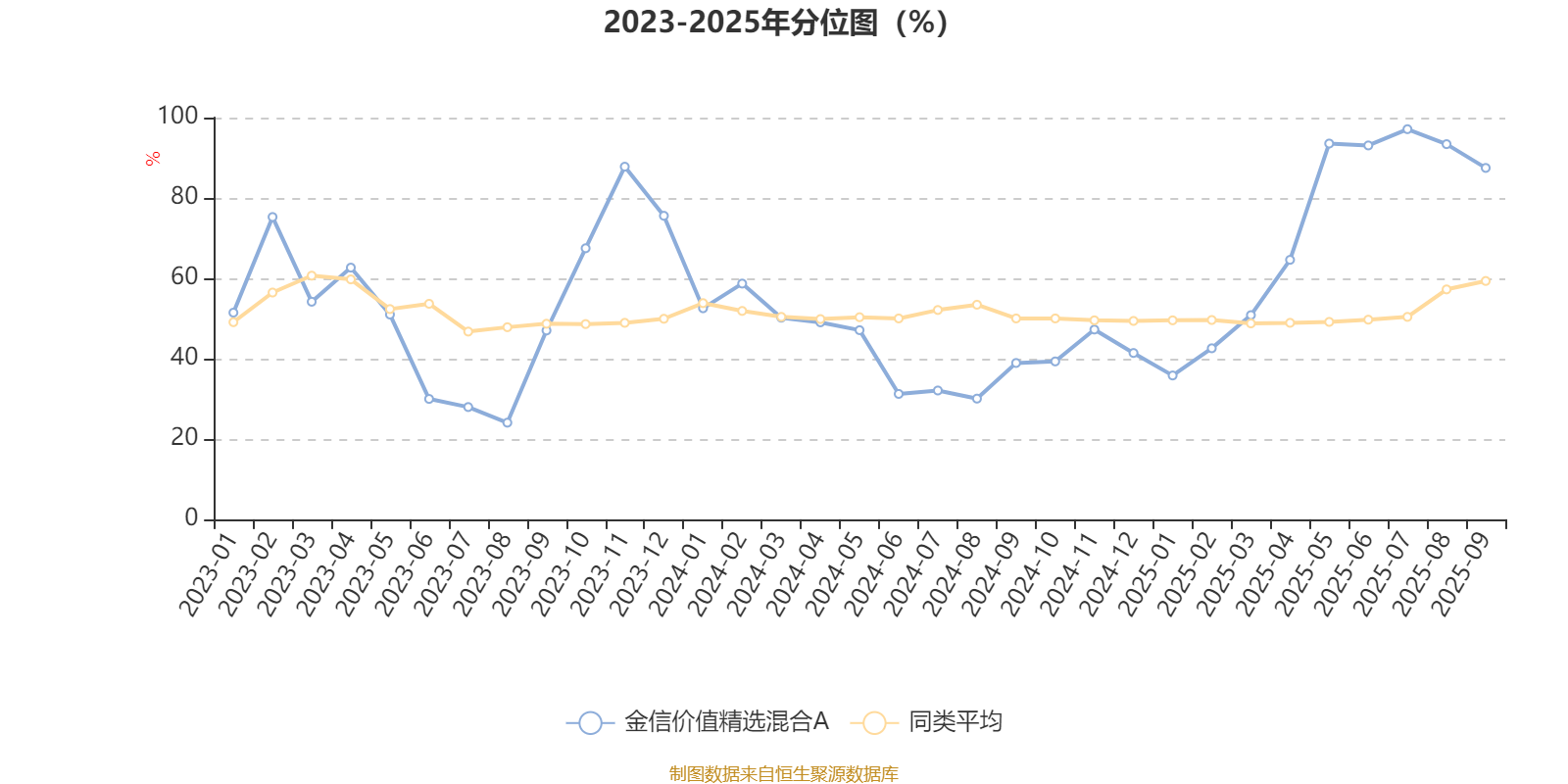 通过所选区间该基金净值增长率分位图,可以观察该基金与同类基金业绩比较情况。图为坐标原点到区间内某时点的净值增长率在同类基金中的分位数。