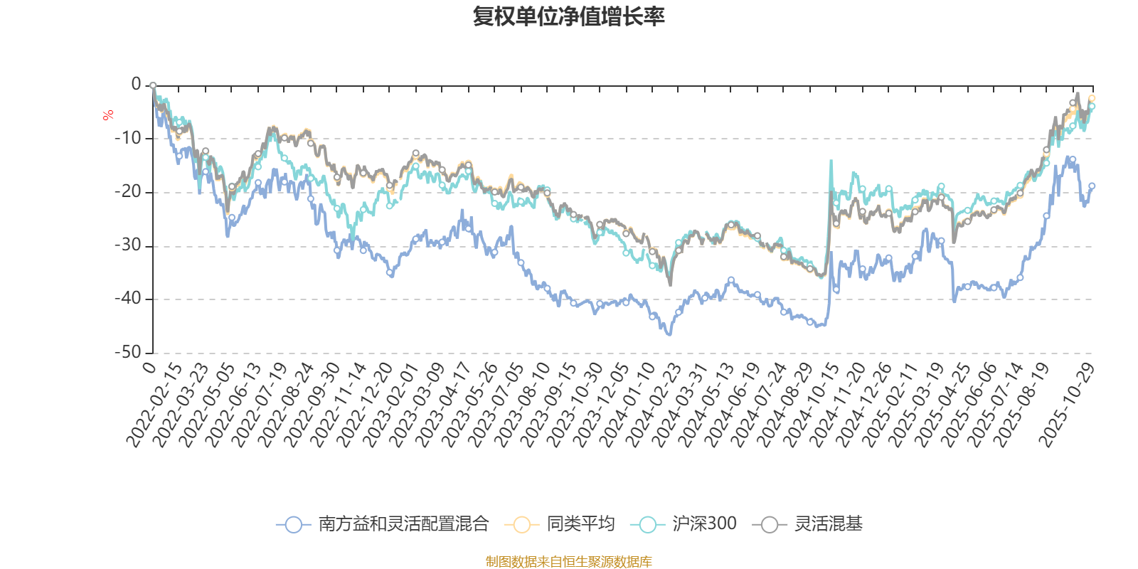 截至10月29日,南方益和灵活配置混合近三个月复权单位净值增长率为16.04%,位于同类可比基金500/1287;近半年复权单位净值增长率为30.02%,位于同类可比基金502/1287;近一年复权单位净值增长率为23.59%,位于同类可比基金655/1287;近三年复权单位净值增长率为17.27%,位于同类可比基金648/1286。