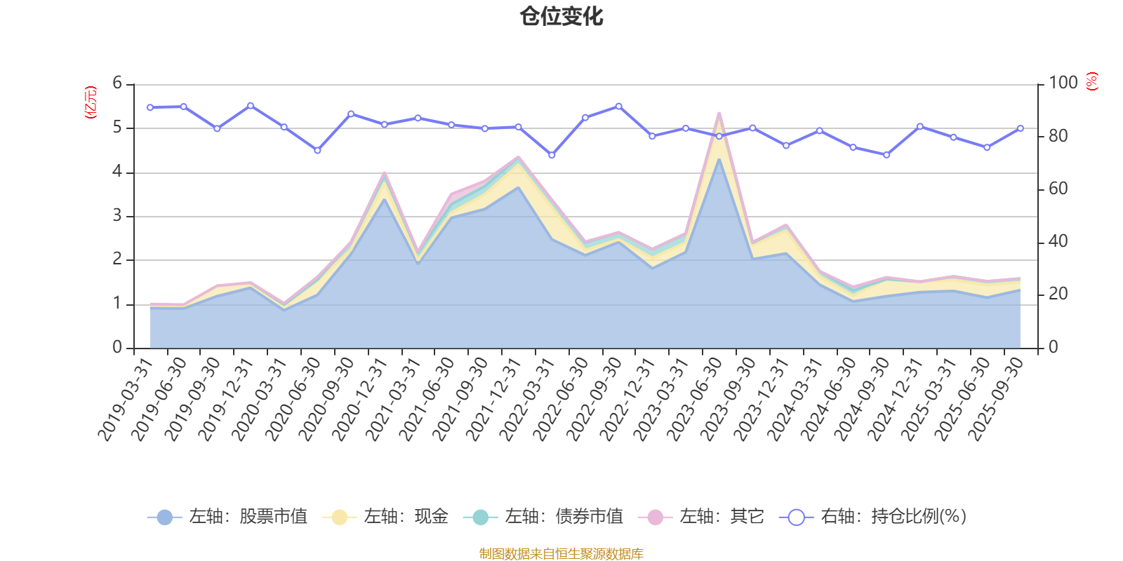 据定期报告数据统计,近三年平均股票仓位为79.91%,同类平均为85.66%。2019年末基金达到91.85%的最高仓位,2022年一季度末最低,为73.14%。
