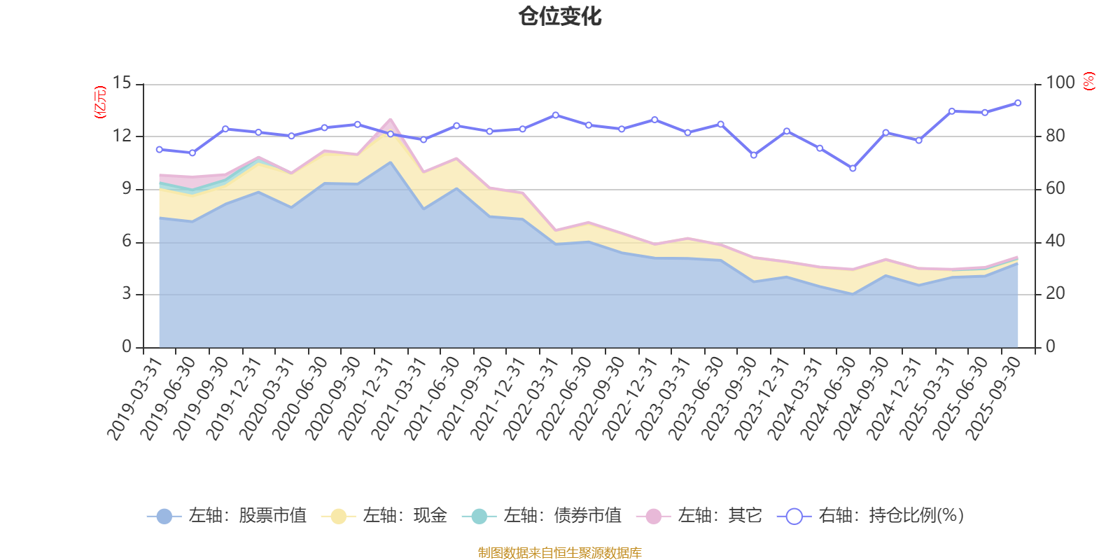 据定期报告数据统计,近三年平均股票仓位为81.95%,同类平均为72.35%。2025年三季度末基金达到92.83%的最高仓位,2024年上半年末最低,为68.01%。