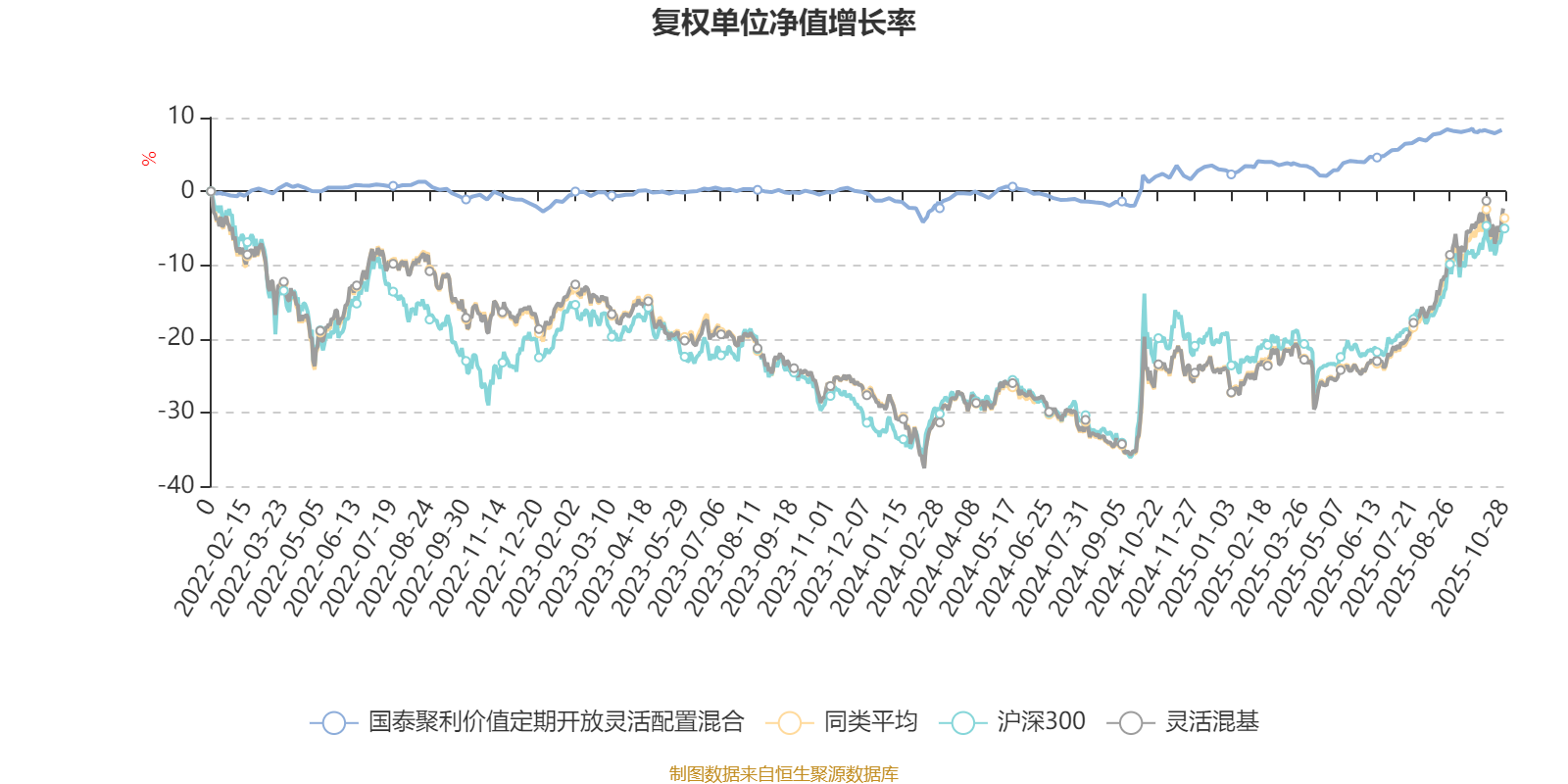 截至10月24日,国泰聚利价值定期开放灵活配置混合近三个月复权单位净值增长率为1.68%,位于同类可比基金1114/1287;近半年复权单位净值增长率为6.08%,位于同类可比基金1110/1287;近一年复权单位净值增长率为6.20%,位于同类可比基金1067/1287;近三年复权单位净值增长率为8.83%,位于同类可比基金829/1286。