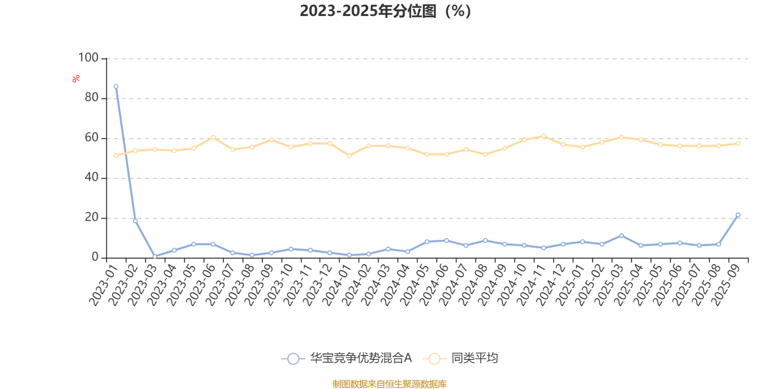 通过所选区间该基金净值增长率分位图,可以观察该基金与同类基金业绩比较情况。图为坐标原点到区间内某时点的净值增长率在同类基金中的分位数。