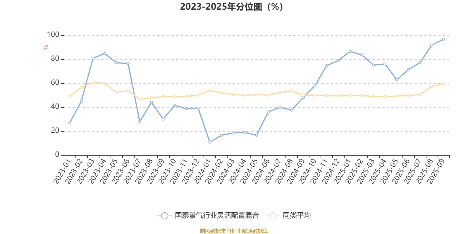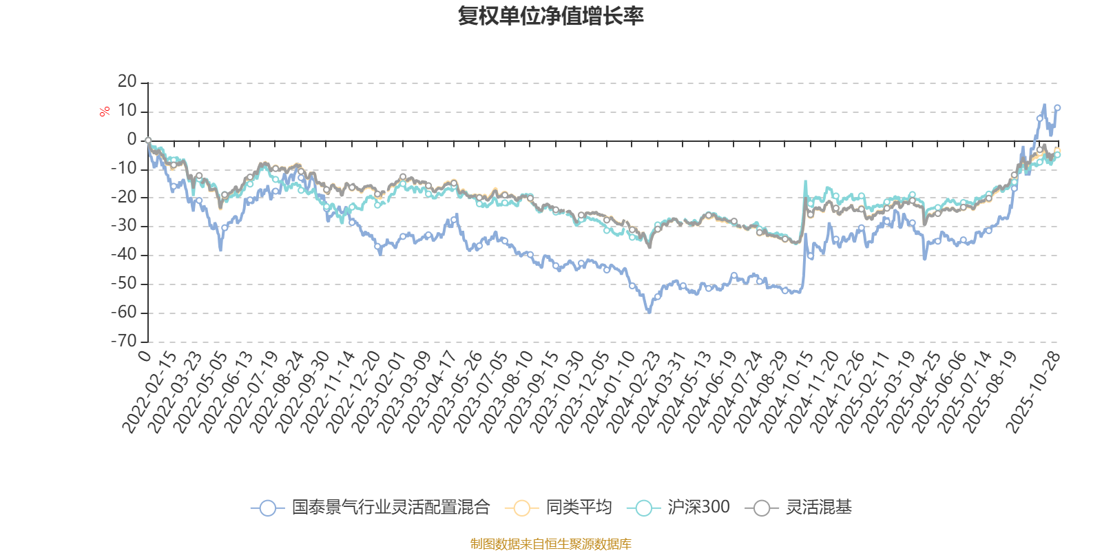 截至10月28日,国泰景气行业灵活配置混合近三个月复权单位净值增长率为53.46%,位于同类可比基金27/1287;近半年复权单位净值增长率为71.73%,位于同类可比基金66/1287;近一年复权单位净值增长率为77.05%,位于同类可比基金45/1287;近三年复权单位净值增长率为48.70%,位于同类可比基金159/1286。