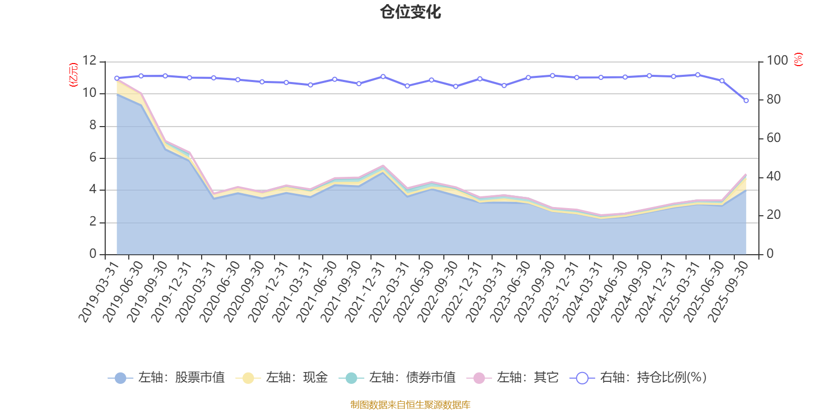 据定期报告数据统计,近三年平均股票仓位为90.52%,同类平均为72.35%。2025年一季度末基金达到93.12%的最高仓位,2025年三季度末最低,为79.76%。