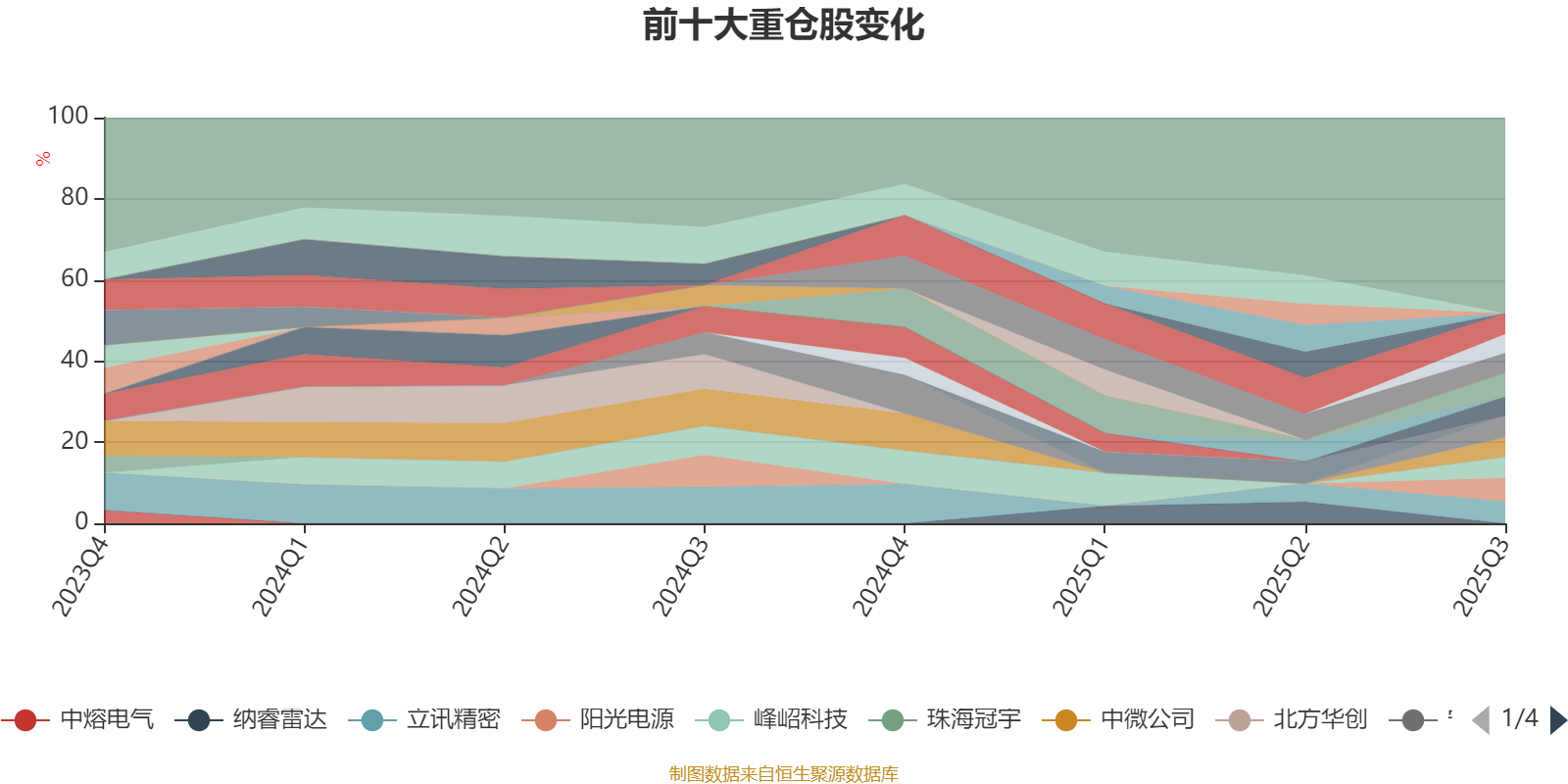 该基金持股集中度较高。截至2025年三季度末,基金十大重仓股分别是恒玄科技、阳光电源、立讯精密、宁德时代、峰岹科技、中芯国际、中微公司、中科飞测、深南电路、海光信息。