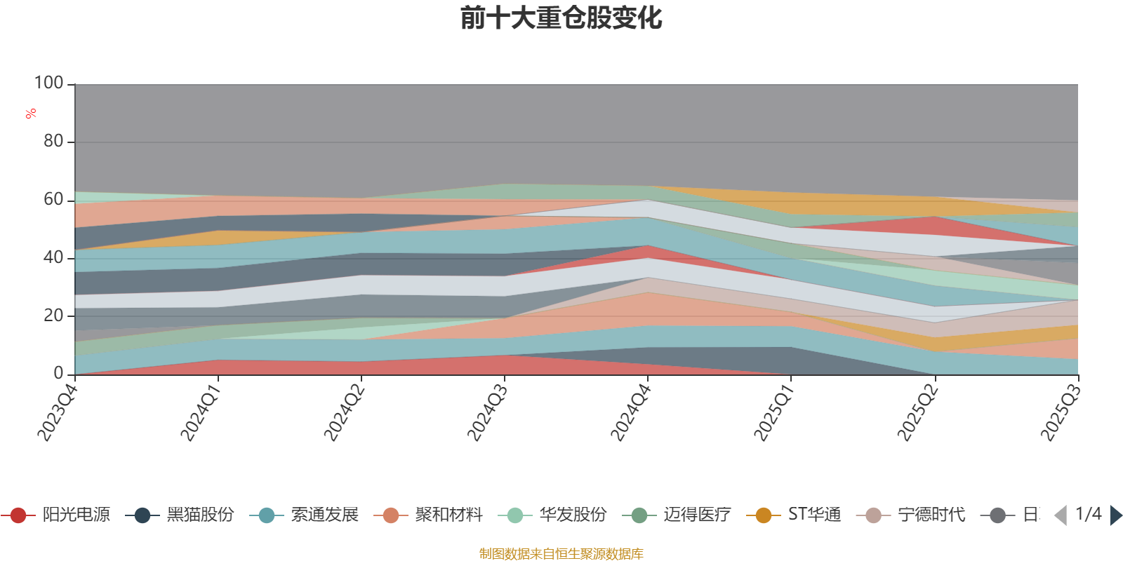 该基金持股集中度较高。截至2025年三季度末,基金十大重仓股分别是宁德时代、英科医疗、聚和材料、美好医疗、深科技、索通发展、明阳电气、振江股份、ST华通、江波龙。