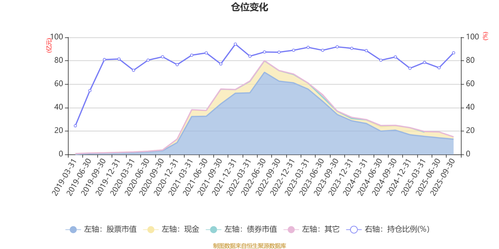 据定期报告数据统计,近三年平均股票仓位为84.79%,同类平均为72.35%。2021年末基金达到94.23%的最高仓位,2019年一季度末最低,为24.53%。