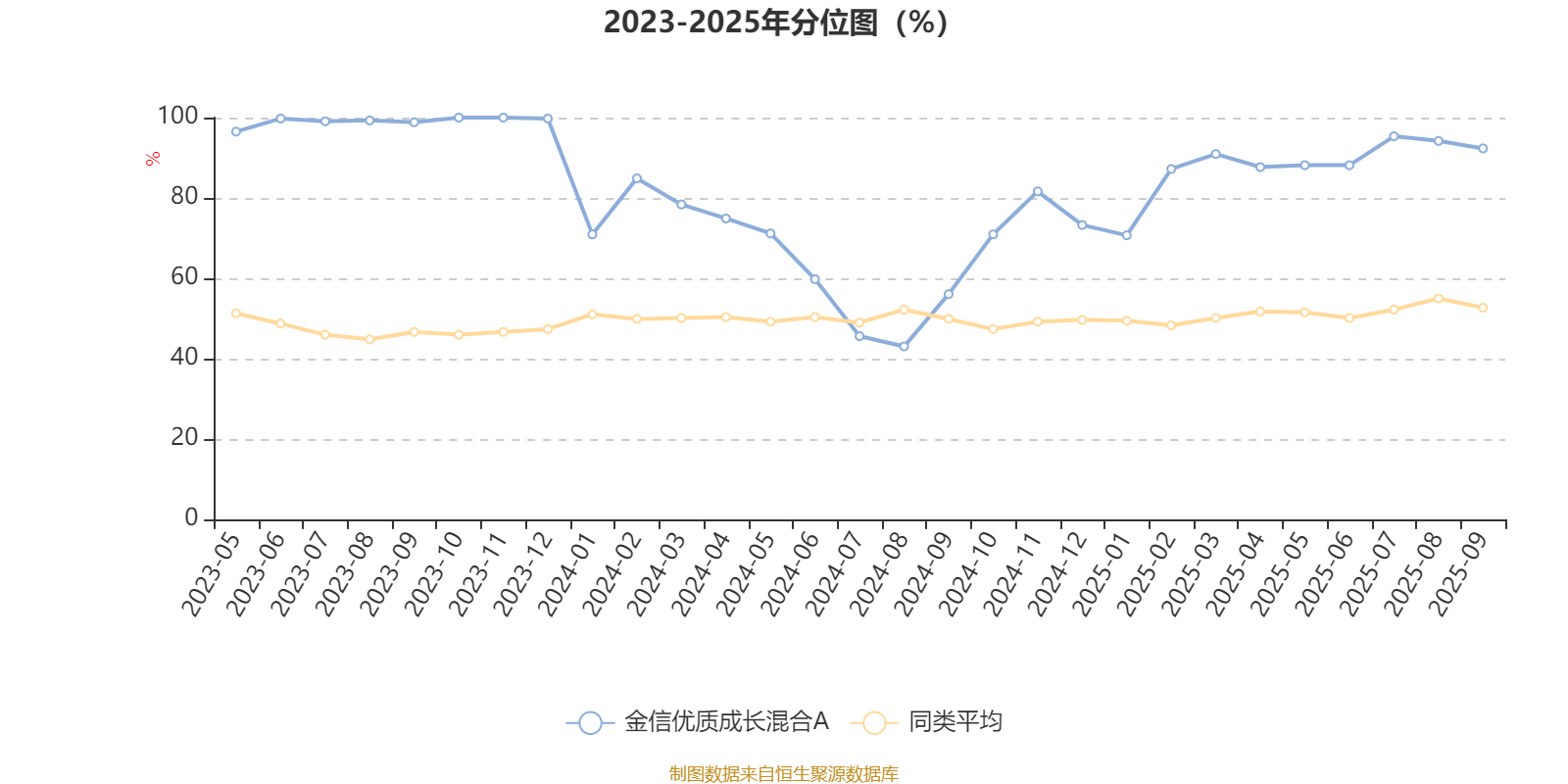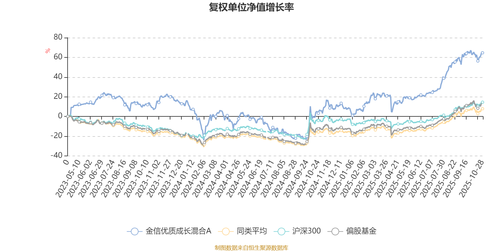 截至10月28日,金信优质成长混合A近三个月复权单位净值增长率为20.02%,位于同类可比基金186/689;近半年复权单位净值增长率为45.59%,位于同类可比基金109/688;近一年复权单位净值增长率为54.44%,位于同类可比基金58/653。