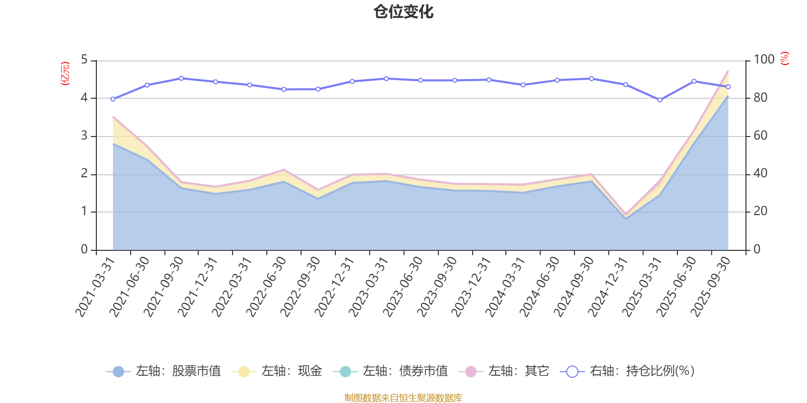 据定期报告数据统计,近三年平均股票仓位为88.09%,同类平均为85.66%。2021年三季度末基金达到90.57%的最高仓位,2025年一季度末最低,为79.18%。