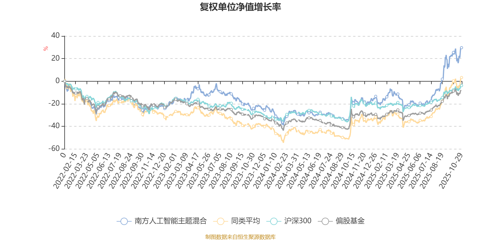 截至10月29日,南方人工智能主题混合近三个月复权单位净值增长率为40.07%,位于同类可比基金86/229;近半年复权单位净值增长率为63.28%,位于同类可比基金89/229;近一年复权单位净值增长率为59.43%,位于同类可比基金98/213;近三年复权单位净值增长率为74.12%,位于同类可比基金46/158。