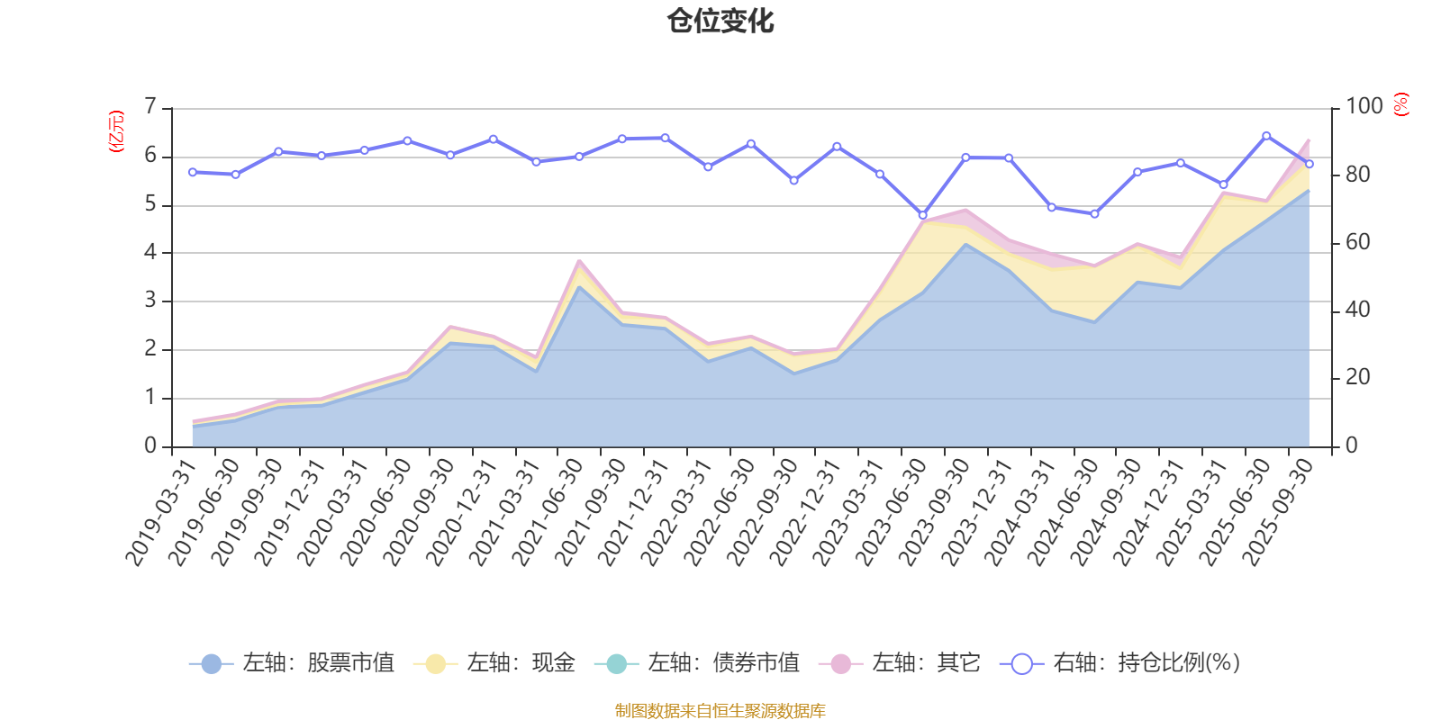 据定期报告数据统计,近三年平均股票仓位为80.44%,同类平均为86.77%。2025年上半年末基金达到91.79%的最高仓位,2023年上半年末最低,为68.39%。