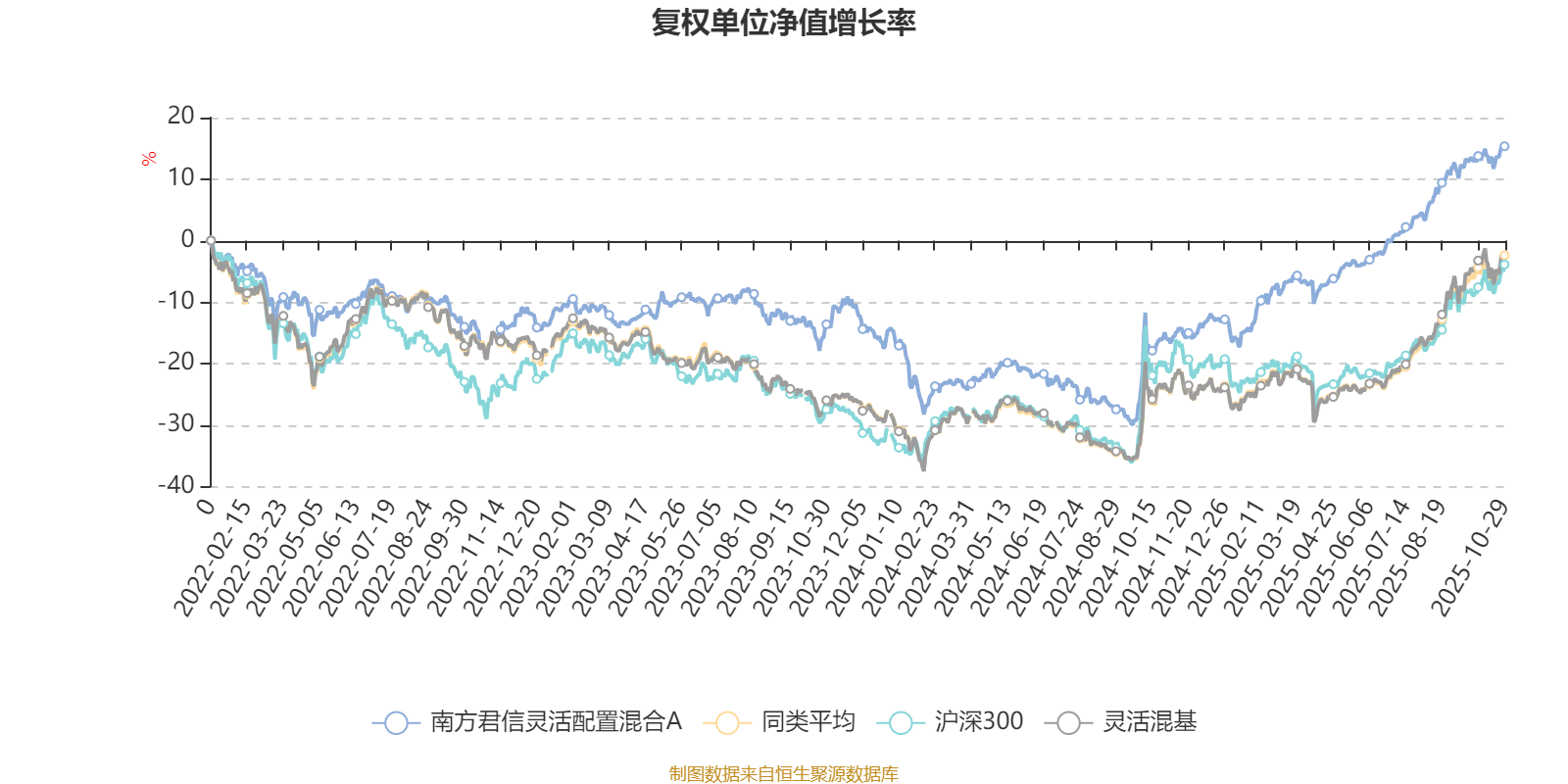 截至10月29日,南方君信灵活配置混合A近三个月复权单位净值增长率为10.44%,位于同类可比基金726/1287;近半年复权单位净值增长率为22.85%,位于同类可比基金701/1287;近一年复权单位净值增长率为37.13%,位于同类可比基金340/1287;近三年复权单位净值增长率为41.52%,位于同类可比基金245/1286。