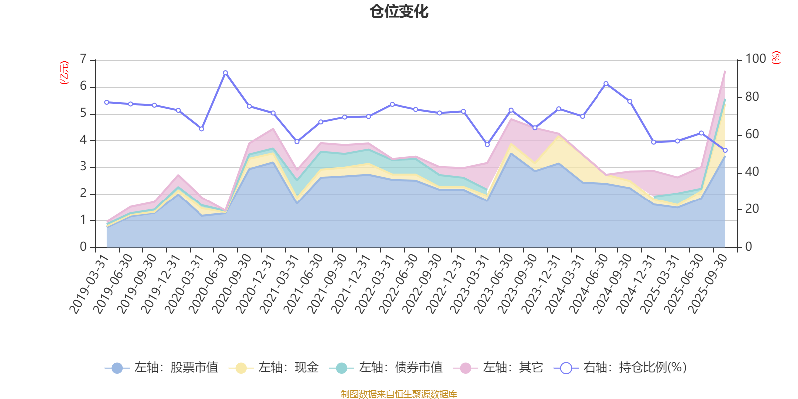 据定期报告数据统计,近三年平均股票仓位为66.65%,同类平均为72.35%。2020年上半年末基金达到93.09%的最高仓位,2025年三季度末最低,为51.92%。