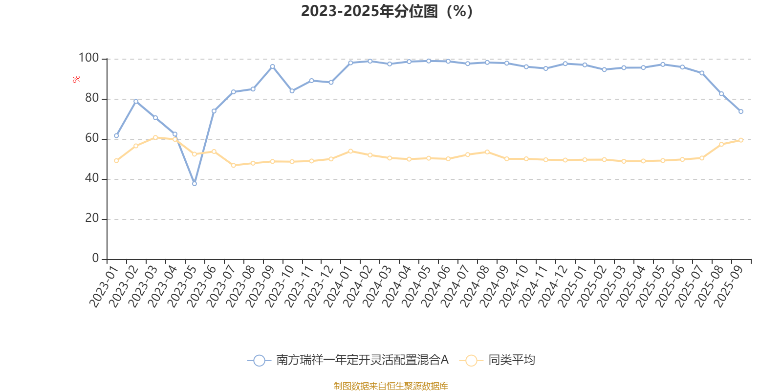 通过所选区间该基金净值增长率分位图,可以观察该基金与同类基金业绩比较情况。图为坐标原点到区间内某时点的净值增长率在同类基金中的分位数。