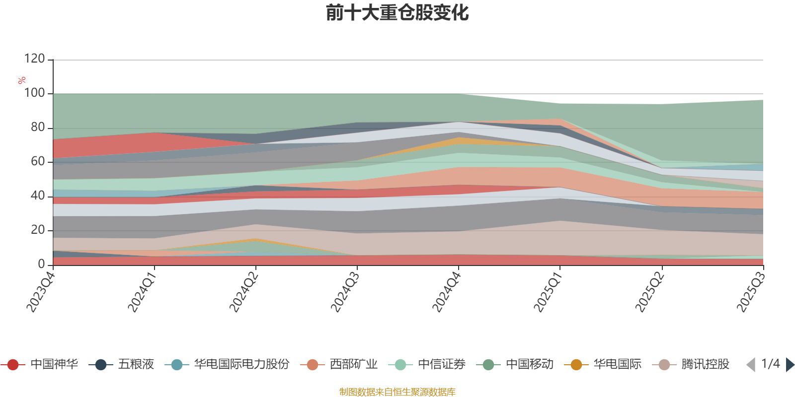 该基金持股集中度较高,近2年前十大重仓股集中度长期超过60%。截至2025年三季度末,基金十大重仓股分别是腾讯控股、宁德时代、工商银行、阿里巴巴-W、新华保险、北京银行、香港交易所、中国神华、建设银行、中信证券。