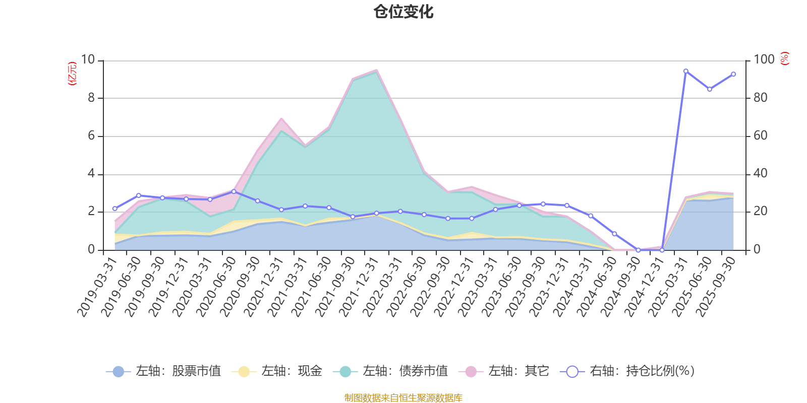 据定期报告数据统计,近三年平均股票仓位为34.02%,同类平均为72.35%。2025年一季度末基金达到94.39%的最高仓位,2024年上半年末最低,为8.6%。