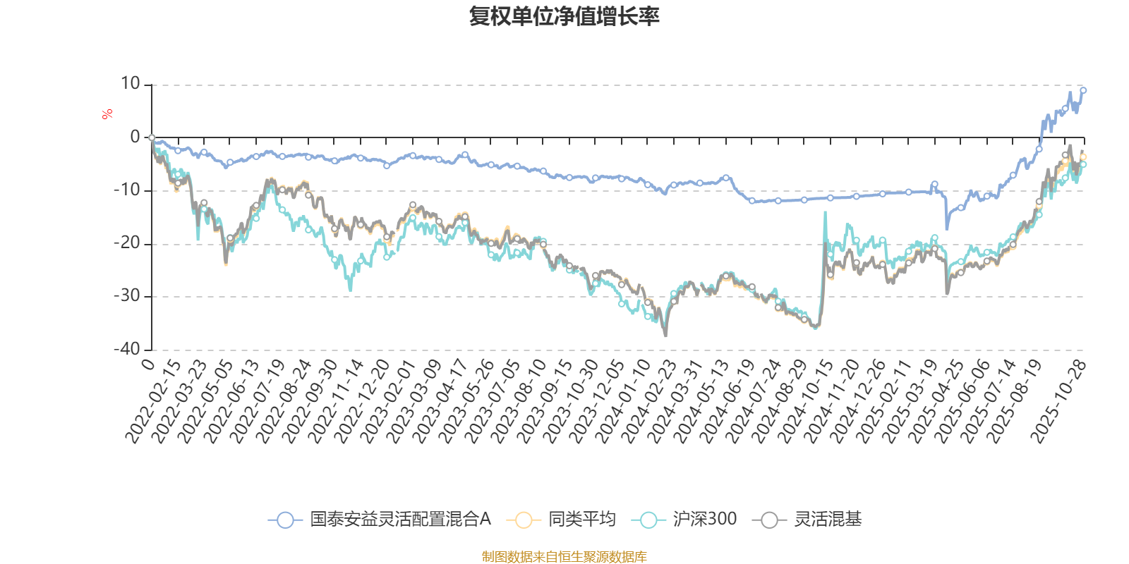 截至10月28日,国泰安益灵活配置混合A近三个月复权单位净值增长率为13.76%,位于同类可比基金544/1287;近半年复权单位净值增长率为25.60%,位于同类可比基金599/1287;近一年复权单位净值增长率为22.80%,位于同类可比基金602/1287;近三年复权单位净值增长率为13.46%,位于同类可比基金714/1286。