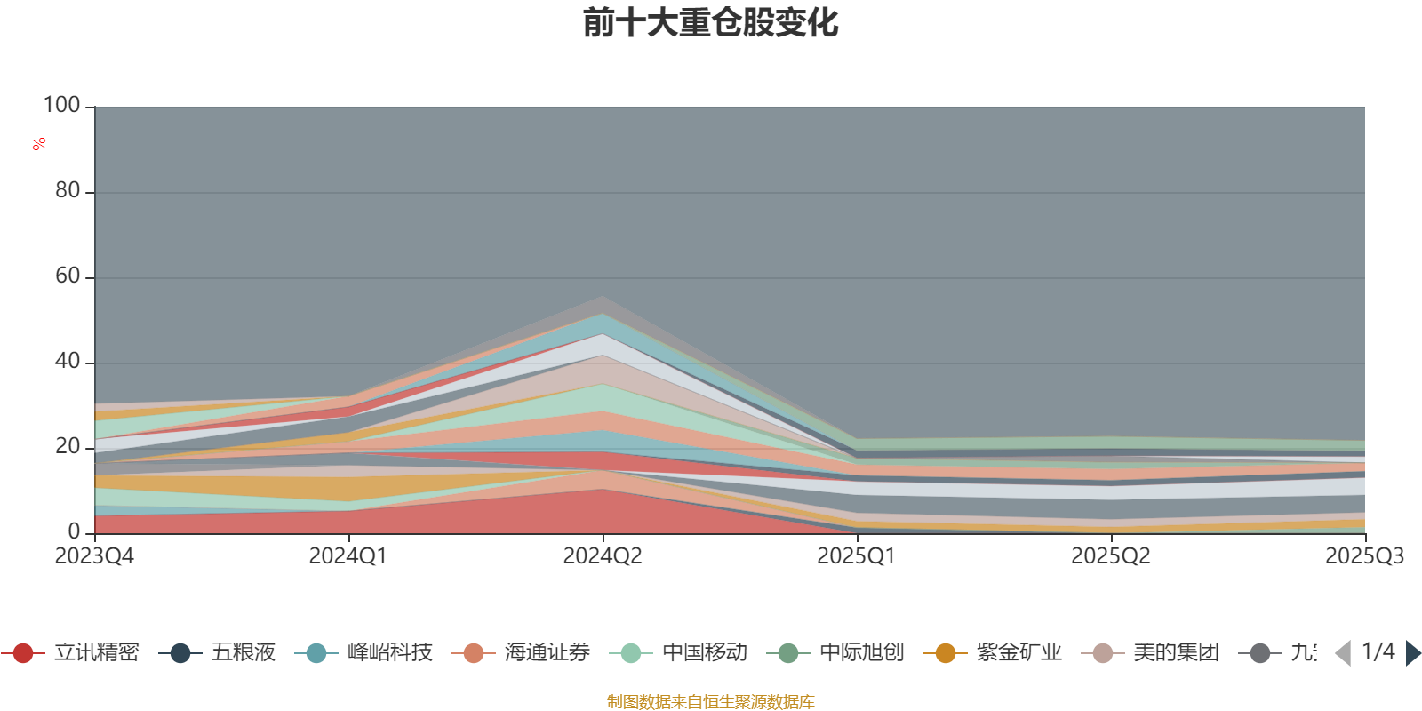 截至2025年三季度末,基金十大重仓股分别是贵州茅台、宁德时代、中国平安、招商银行、紫金矿业、美的集团、恒瑞医药、东方财富、中际旭创、长江电力。