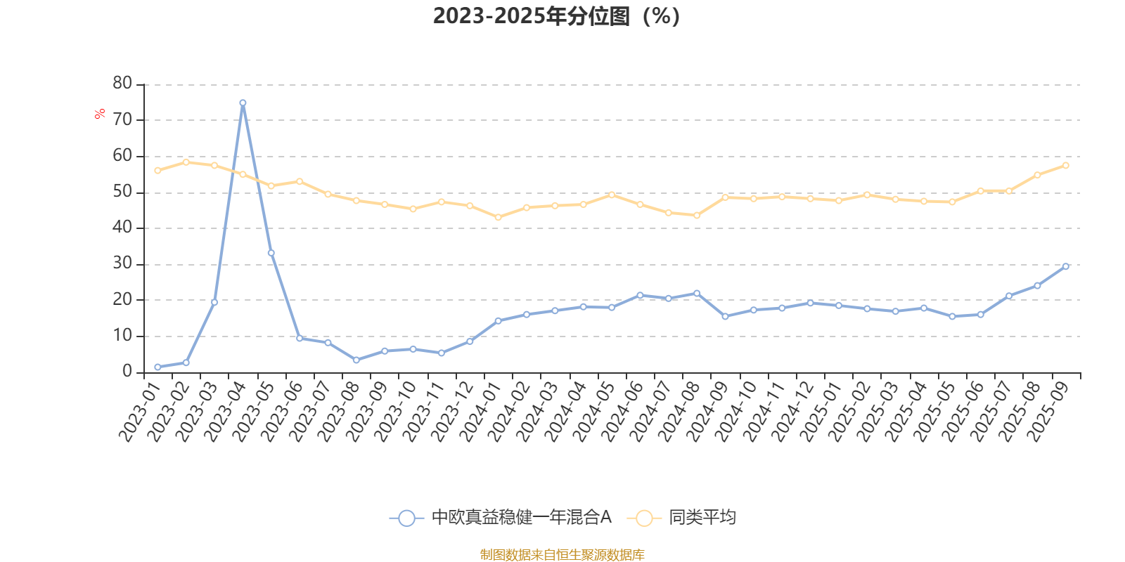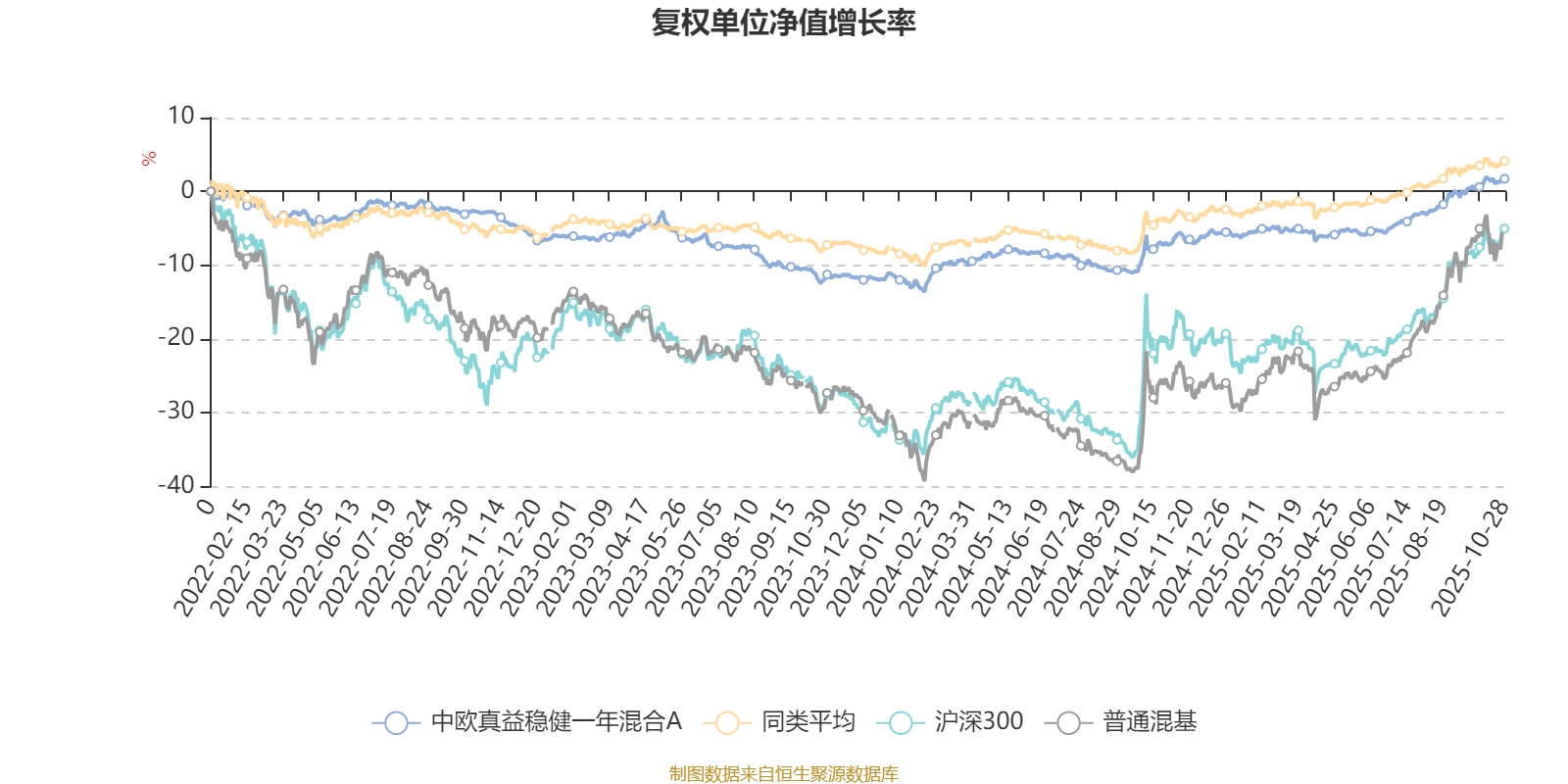 截至10月28日,中欧真益稳健一年混合A近三个月复权单位净值增长率为4.77%,位于同类可比基金112/629;近半年复权单位净值增长率为8.13%,位于同类可比基金154/629;近一年复权单位净值增长率为9.27%,位于同类可比基金175/623;近三年复权单位净值增长率为4.70%,位于同类可比基金476/557。
