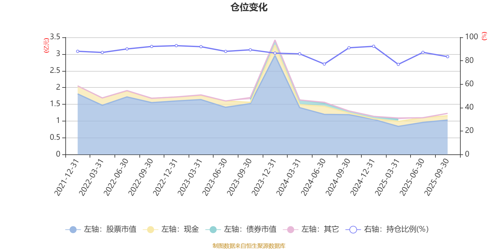 据定期报告数据统计,近三年平均股票仓位为86.93%,同类平均为83.73%。2022年末基金达到92.92%的最高仓位,2025年一季度末最低,为76.95%。