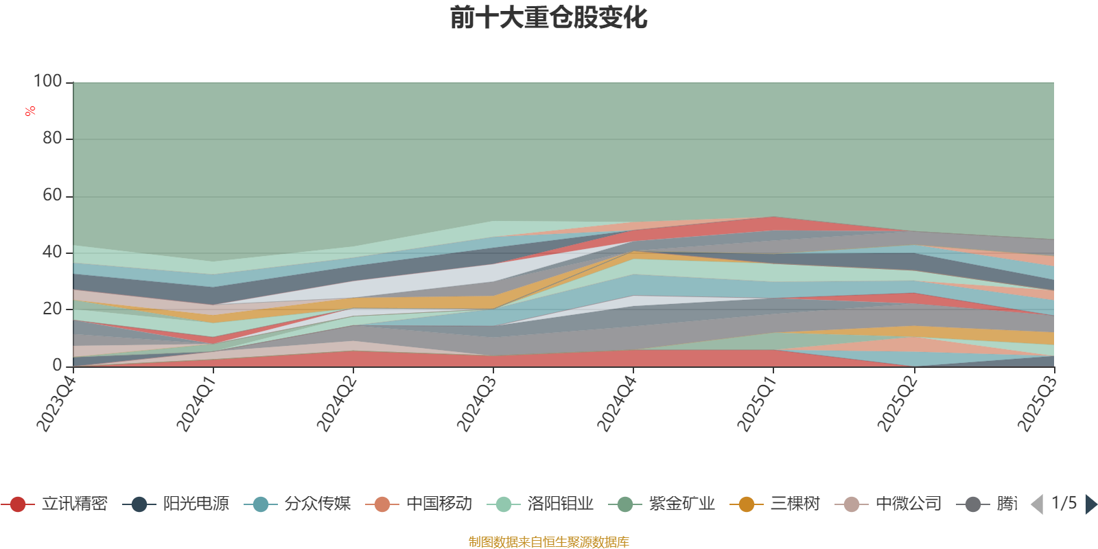 截至2025年三季度末,基金十大重仓股分别是腾讯控股、阿里巴巴-W、宁德时代、小米集团-W、三棵树、洛阳钼业、阳光电源、思特威、中国生物制药、小商品城。