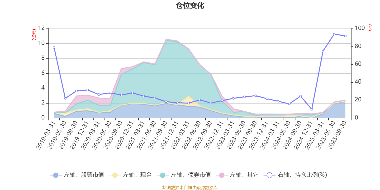 据定期报告数据统计,近三年平均股票仓位为36.64%,同类平均为72.35%。2025年上半年末基金达到93.71%的最高仓位,2024年末最低,为9.62%。