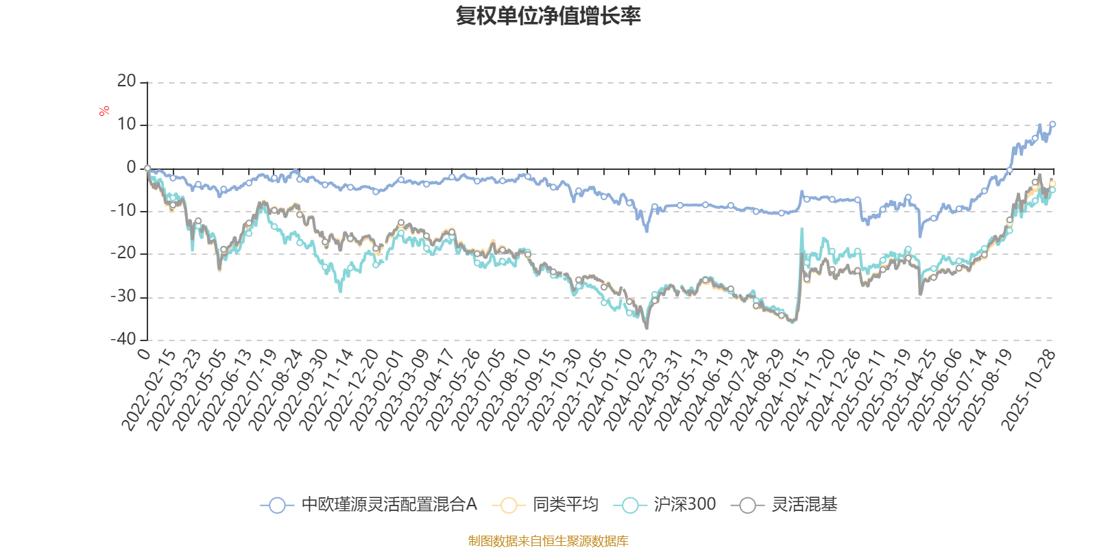 截至10月28日,中欧瑾源灵活配置混合A近三个月复权单位净值增长率为12.77%,位于同类可比基金582/1287;近半年复权单位净值增长率为24.95%,位于同类可比基金613/1287;近一年复权单位净值增长率为18.38%,位于同类可比基金712/1287;近三年复权单位净值增长率为15.97%,位于同类可比基金645/1286。
