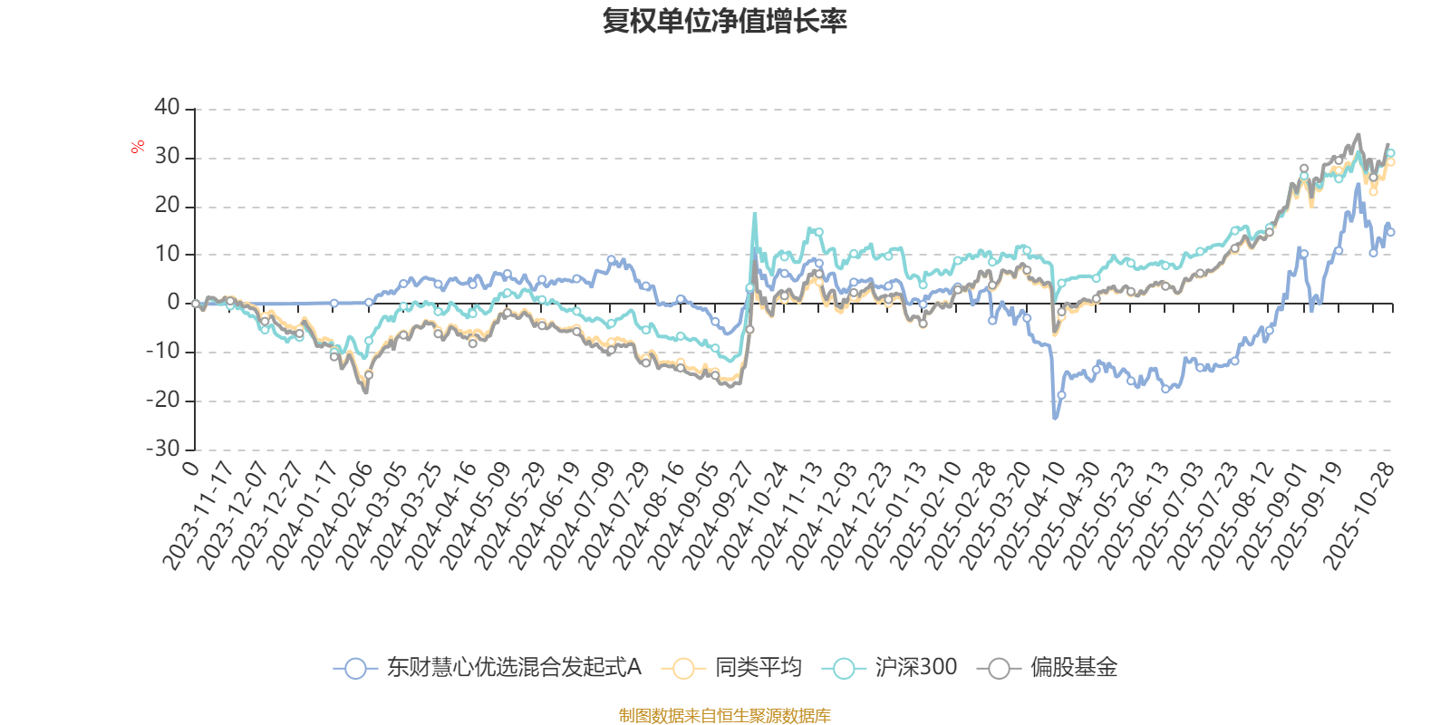 截至10月28日,东财慧心优选混合发起式A近三个月复权单位净值增长率为25.48%,位于同类可比基金118/689;近半年复权单位净值增长率为36.56%,位于同类可比基金207/688;近一年复权单位净值增长率为8.07%,位于同类可比基金583/653。