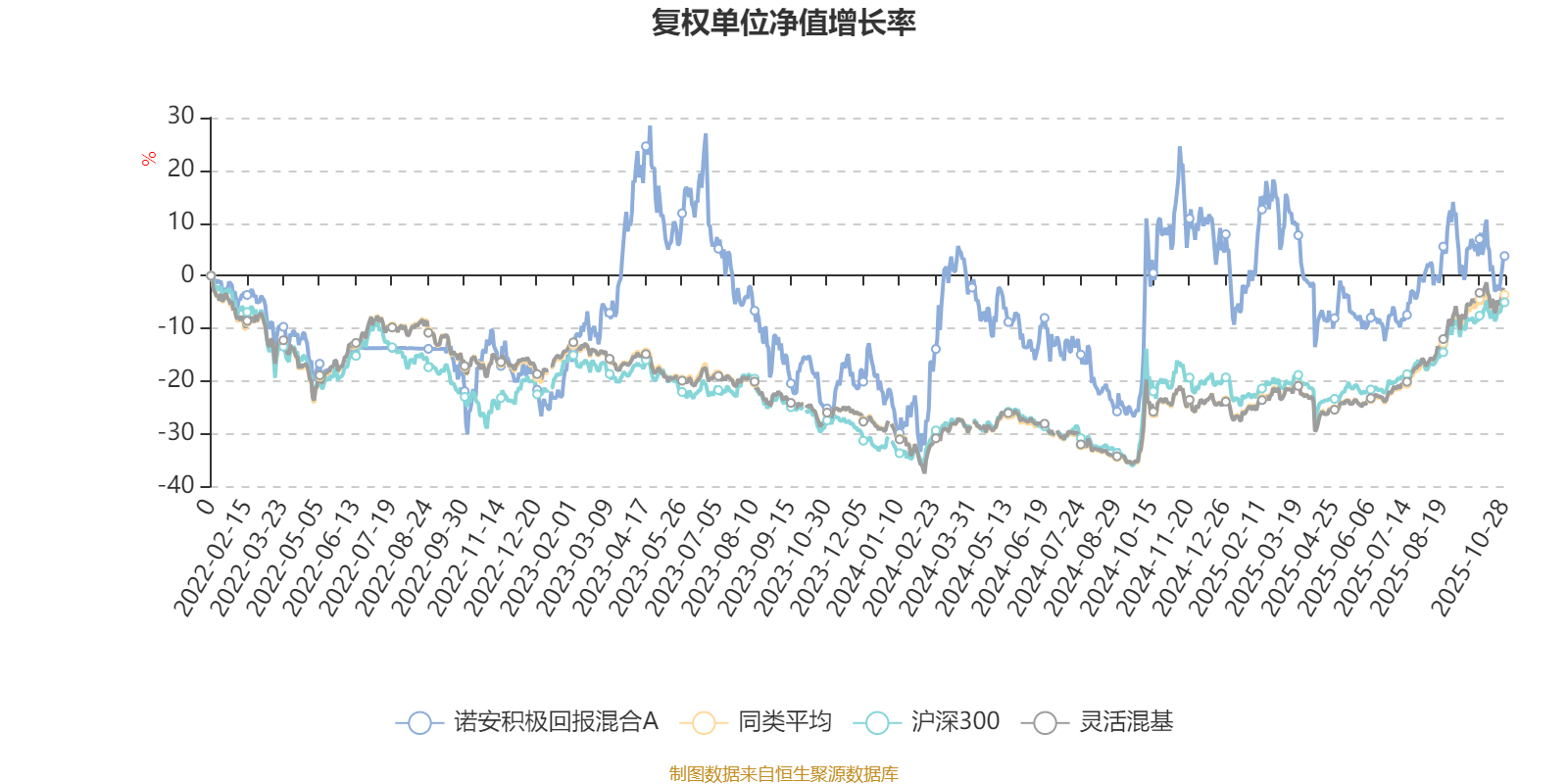 截至10月28日,诺安积极回报混合A近三个月复权单位净值增长率为4.59%,位于同类可比基金946/1287;近半年复权单位净值增长率为13.19%,位于同类可比基金954/1287;近一年复权单位净值增长率为-4.88%,位于同类可比基金1268/1287;近三年复权单位净值增长率为21.65%,位于同类可比基金525/1286。