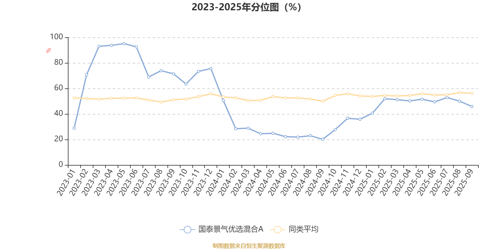 通过所选区间该基金净值增长率分位图,可以观察该基金与同类基金业绩比较情况。图为坐标原点到区间内某时点的净值增长率在同类基金中的分位数。
