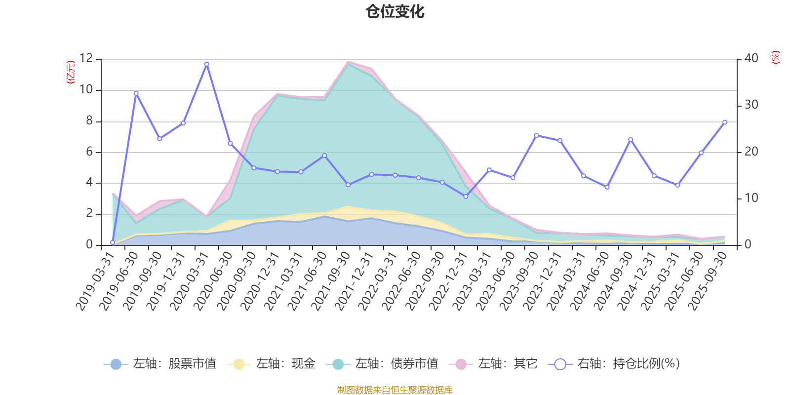 据定期报告数据统计,近三年平均股票仓位为17.63%,同类平均为72.35%。2020年一季度末基金达到38.93%的最高仓位,2019年一季度末最低,为0.58%。