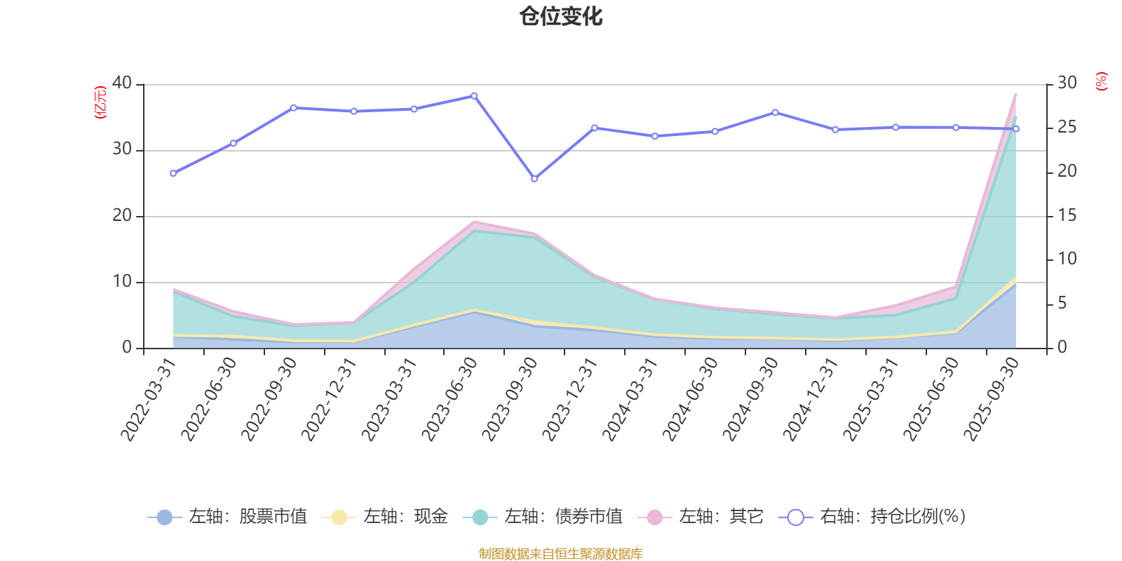 据定期报告数据统计,近三年平均股票仓位为25.21%,同类平均为19.14%。2023年上半年末基金达到28.67%的最高仓位,2023年三季度末最低,为19.25%。