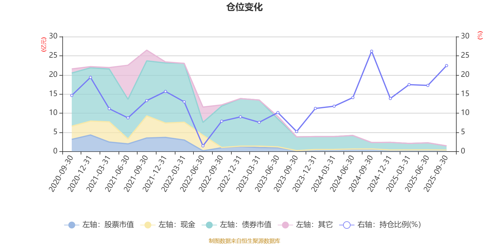 据定期报告数据统计,近三年平均股票仓位为13.86%,同类平均为19.14%。2024年三季度末基金达到26.19%的最高仓位,2022年上半年末最低,为1.46%。