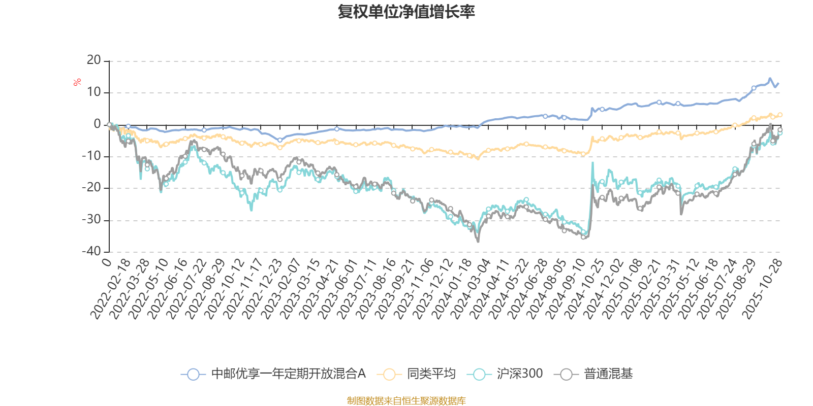 截至10月24日,中邮优享一年定期开放混合A近三个月复权单位净值增长率为4.83%,位于同类可比基金109/629;近半年复权单位净值增长率为6.74%,位于同类可比基金223/629;近一年复权单位净值增长率为7.72%,位于同类可比基金245/623;近三年复权单位净值增长率为14.65%,位于同类可比基金187/557。