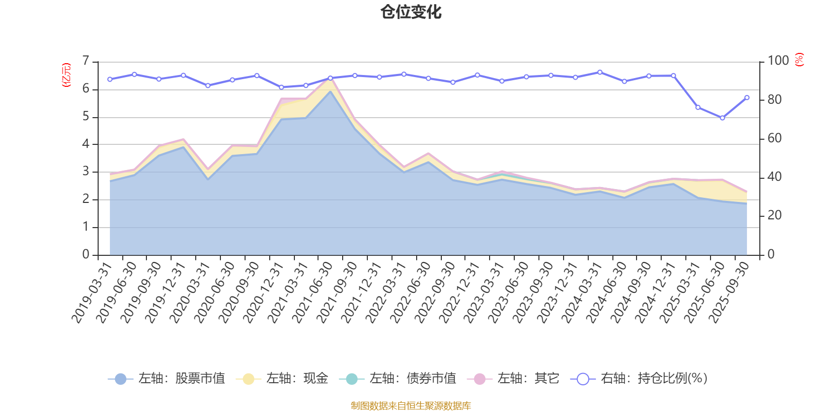 据定期报告数据统计,近三年平均股票仓位为88.21%,同类平均为72.35%。2024年一季度末基金达到94.54%的最高仓位,2025年上半年末最低,为70.92%。