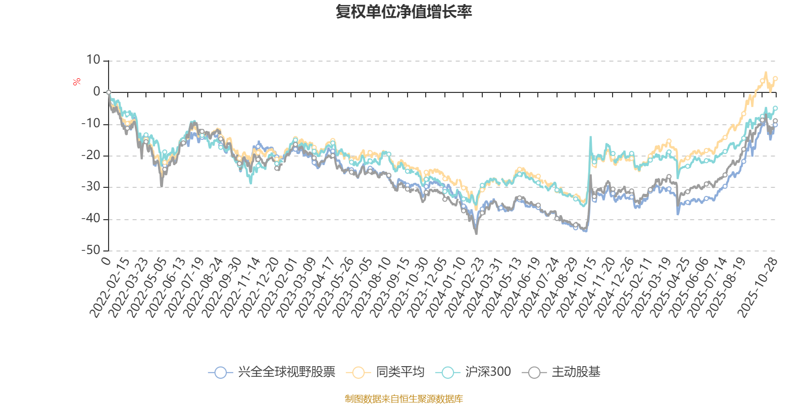 截至10月28日,兴全全球视野股票近三个月复权单位净值增长率为21.02%,位于同类可比基金21/58;近半年复权单位净值增长率为38.43%,位于同类可比基金17/57;近一年复权单位净值增长率为32.02%,位于同类可比基金24/57;近三年复权单位净值增长率为15.75%,位于同类可比基金45/56。