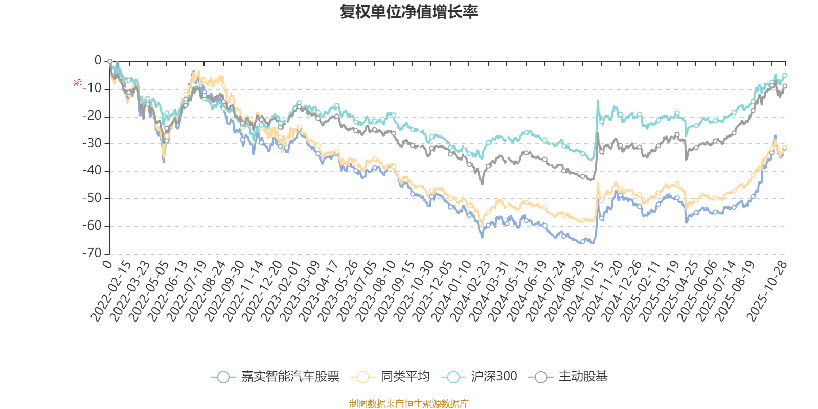 截至10月28日,嘉实智能汽车股票近三个月复权单位净值增长率为39.32%,位于同类可比基金4/39;近半年复权单位净值增长率为54.20%,位于同类可比基金5/39;近一年复权单位净值增长率为44.48%,位于同类可比基金6/38;近三年复权单位净值增长率为3.64%,位于同类可比基金14/29。