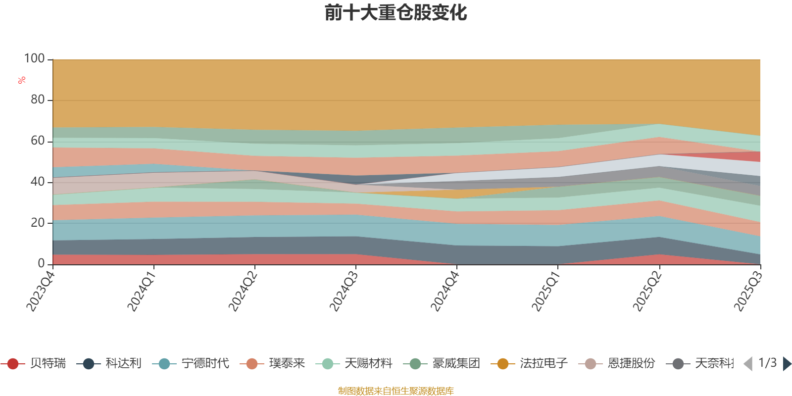 该基金持股集中度较高,且持股标的较为稳定,近2年前十大重仓股集中度长期超过60%。截至2025年三季度末,基金十大重仓股分别是宁德时代、天赐材料、亿纬锂能、璞泰来、湖南裕能、中矿资源、豪威集团、科达利、华友钴业、天奈科技。
