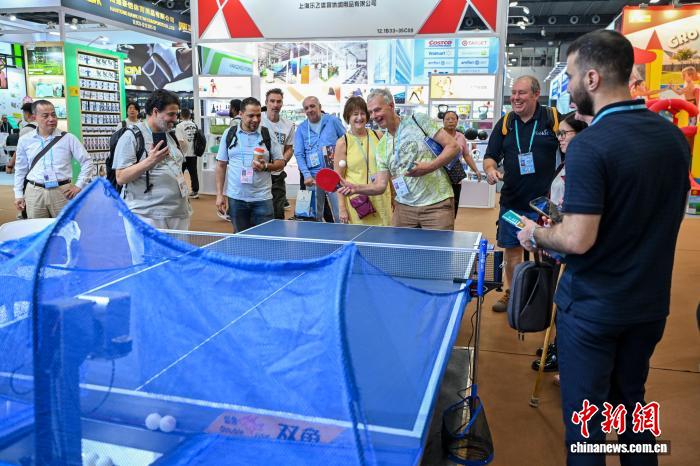 11月1日,第138届广交会第三期继续在广州举办。图为境外采购商正在体验中国企业展出的乒乓球智能发球机。中新社记者陈骥旻摄