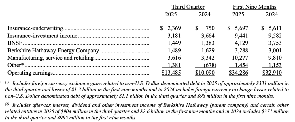 分业务来看,伯克希尔三季度运营利润的大幅增长主要由保险承保业务推动。公司保险承保收益飙升200%以上,达到23.7亿美元;保险承保业务收入为31.8亿美元,同比下降13%;公司铁路业务净利润同比增长4.7%至14.49亿美元;能源业务运营利润为14.89亿美元,同比下降8.6%;制造、服务和零售业务贡献36.2亿美元经营利润,成为最大单一业务板块。