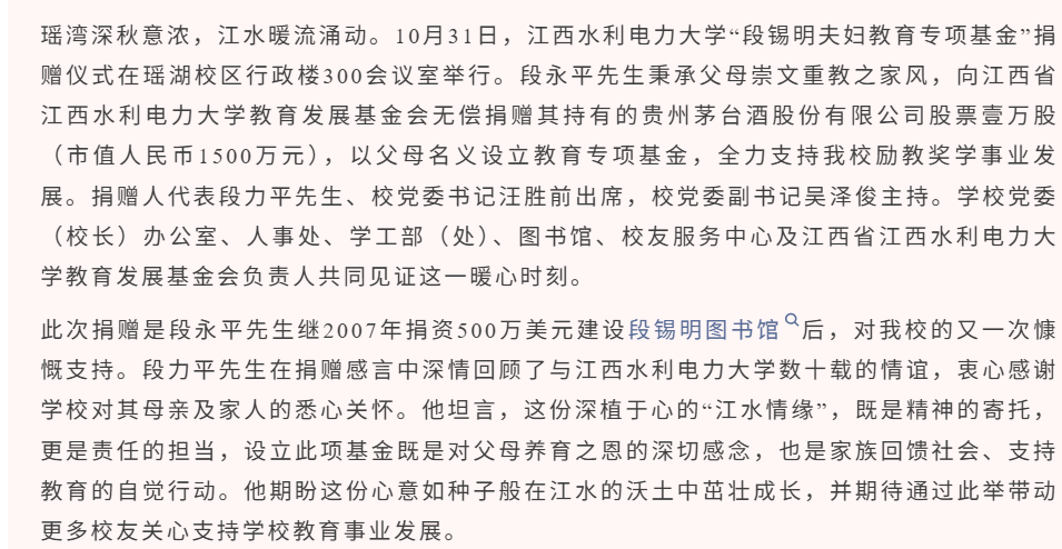 据了解,此次捐赠是段永平继2007年捐资500万美元建设段锡明图书馆后,对江西水利电力大学的又一次支持。